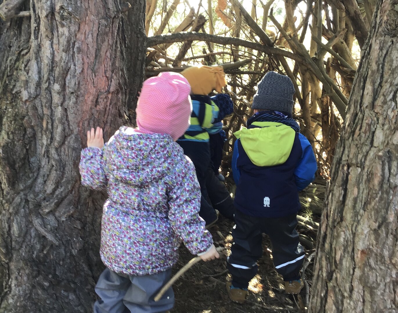 Drei Kinder gehen zwischen 2 Bäumen durch und bauen dort aus Ästen eine Bude.