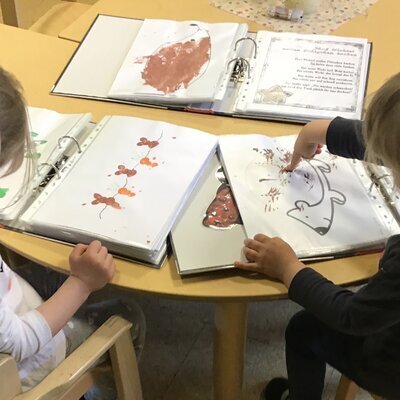 • Am Seitenrand erkennt man links und rechts je ein Kind. Sie sitzen an einem Tisch´und arbeiten mit Farbe an eigenen Bildern.